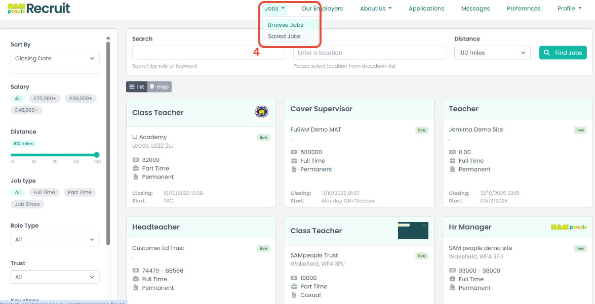 4. To view your saved jobs, access the Jobs drop-down list and select Saved Jobs.