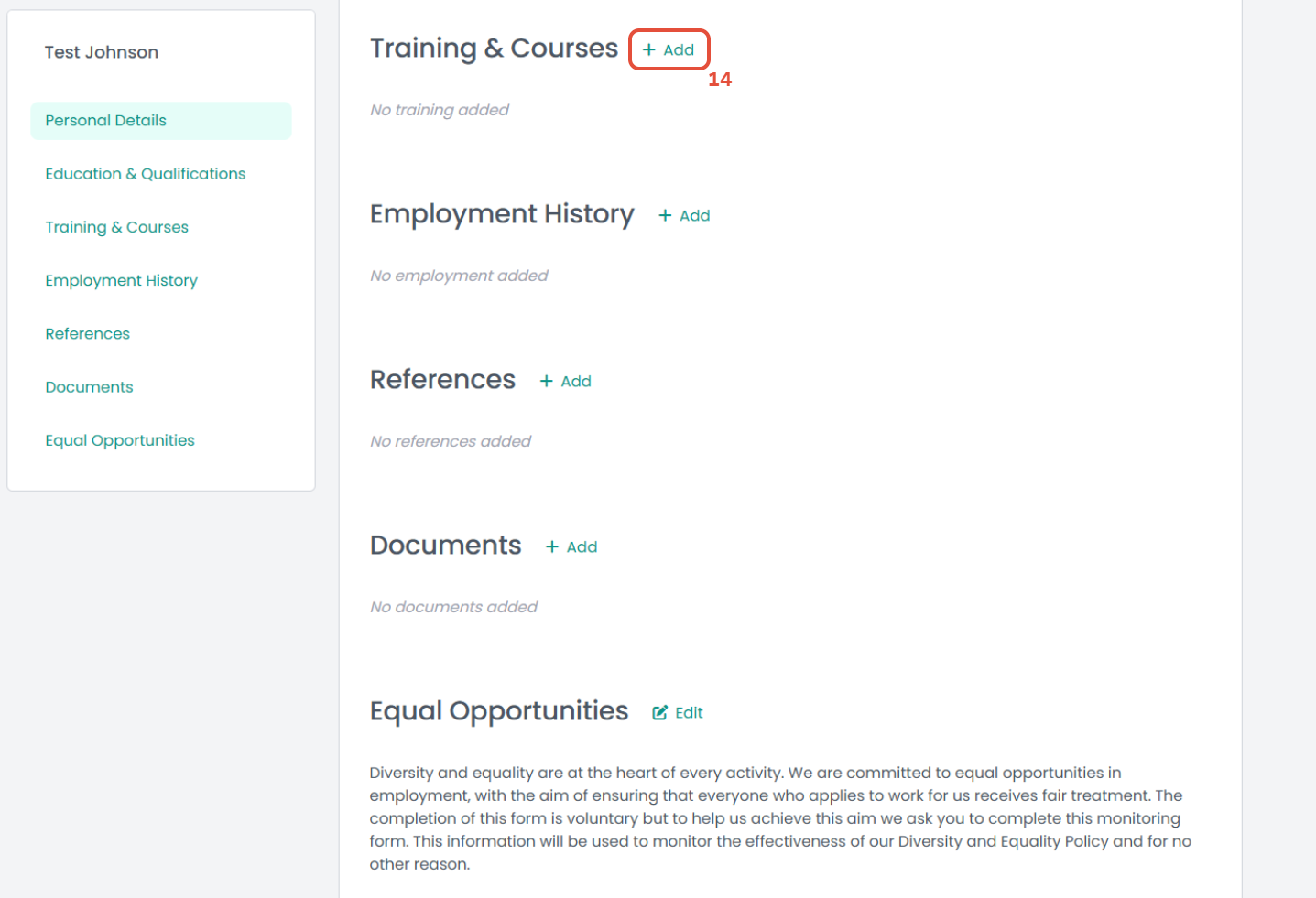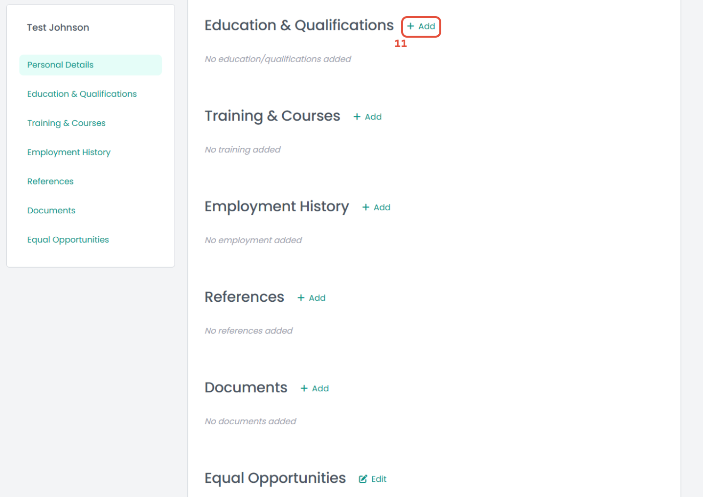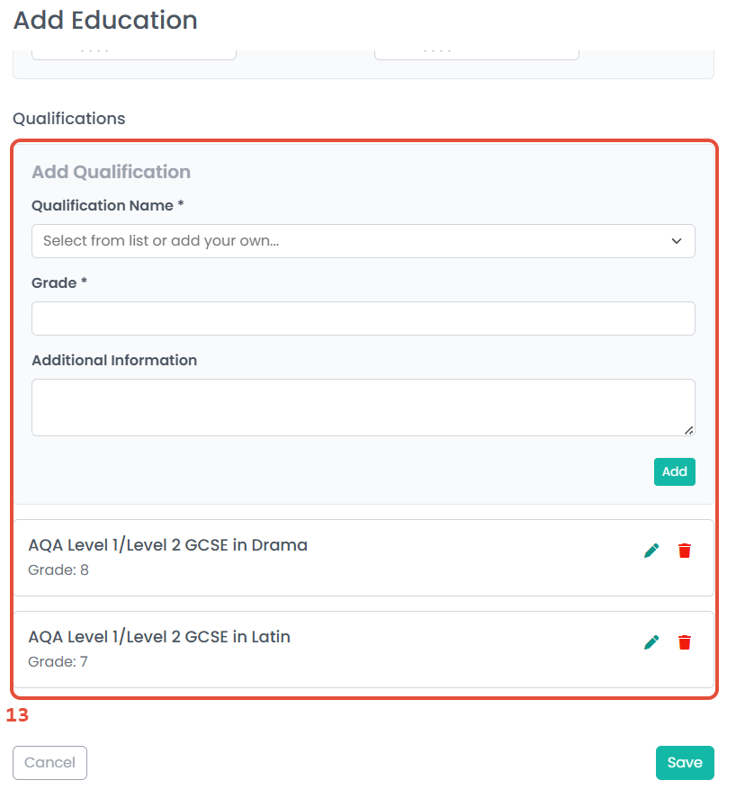13. Qualifications can be added from a drop-down list of options or can be entered manually. Select Add to include these in the list of qualifications displayed below. Qualifications can also be edited or deleted from the list.