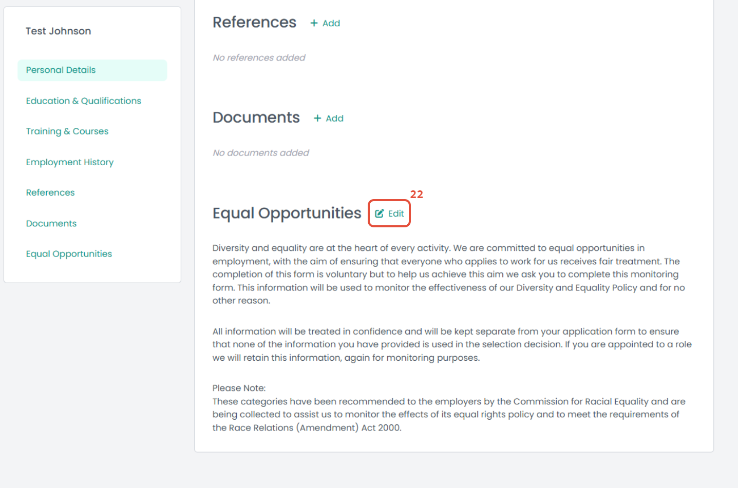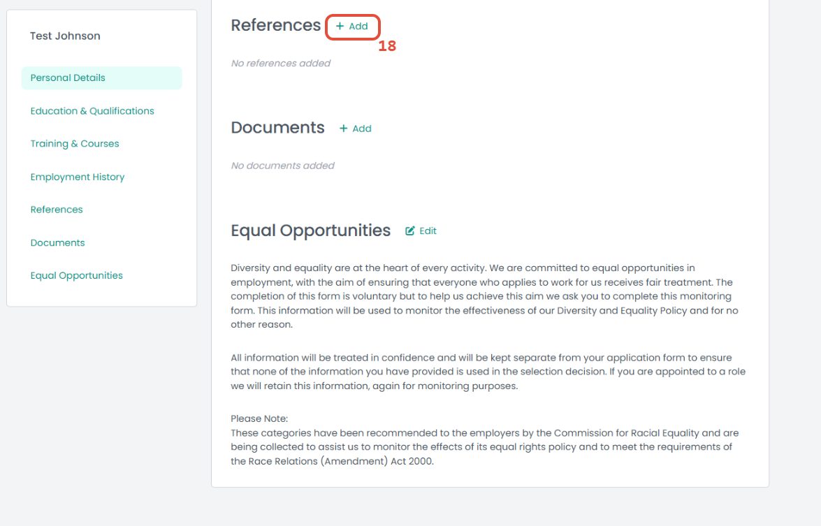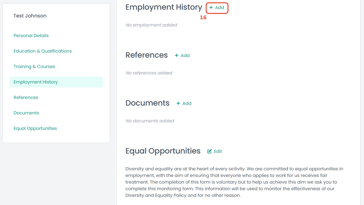 13. Qualifications can be added from a drop-down list of options or can be entered manually. Select Add to include these in the list of qualifications displayed below. Qualifications can also be edited or deleted from the list.