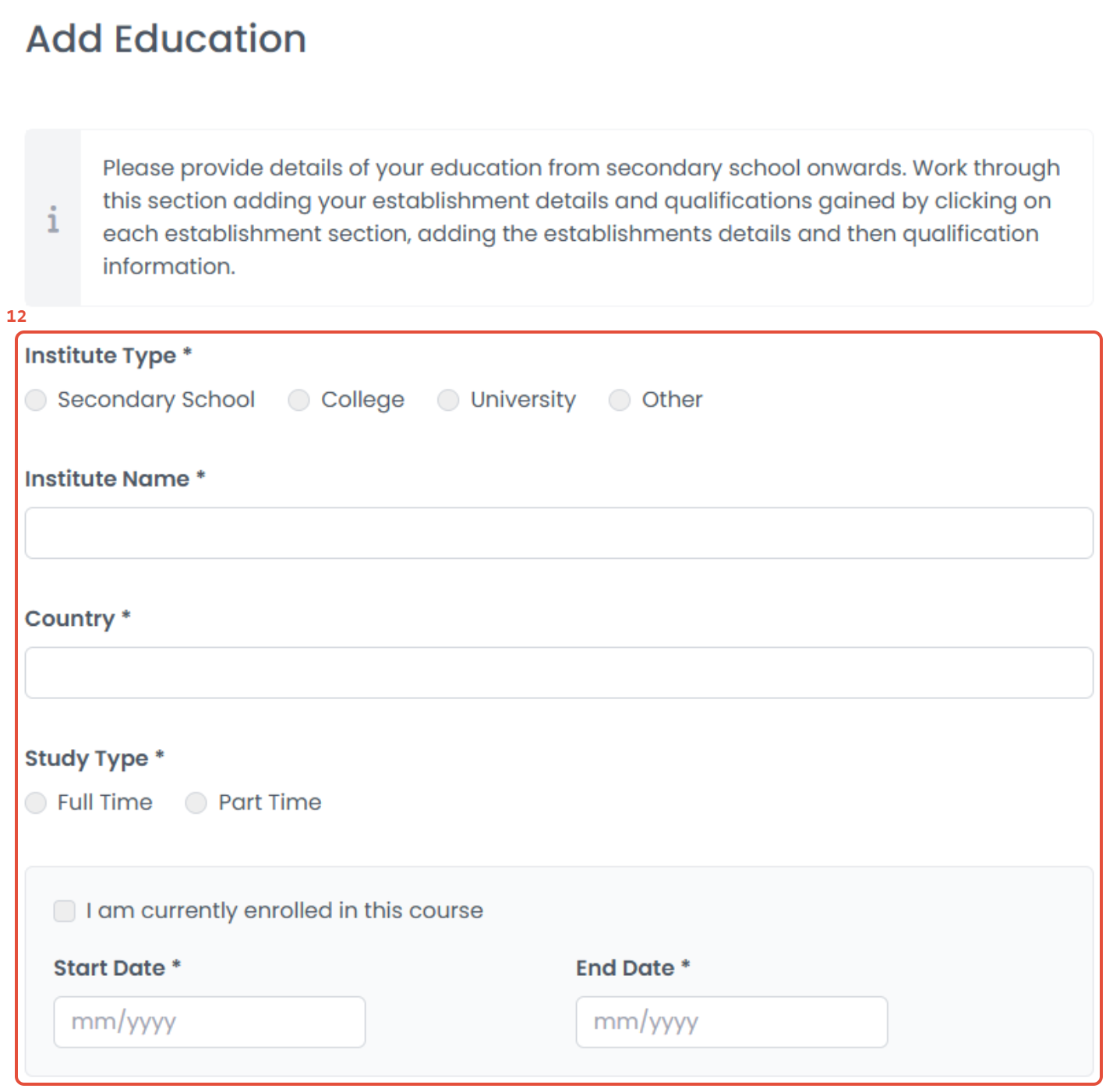 12. Enter the information for the institute. Multiple institutes can be added within the profile area.