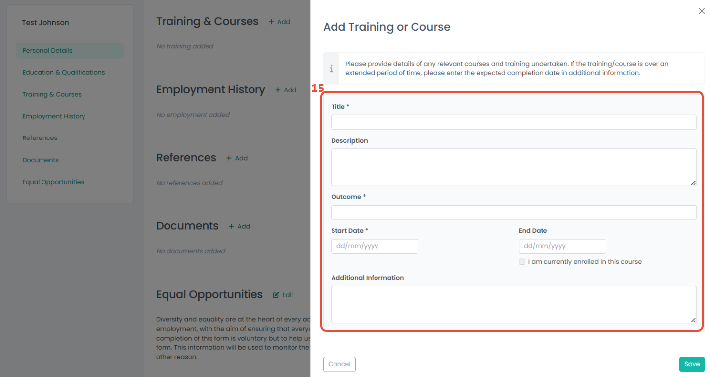 15. Complete the fields to enter training or course information and click Save. This action can be repeated as needed.
