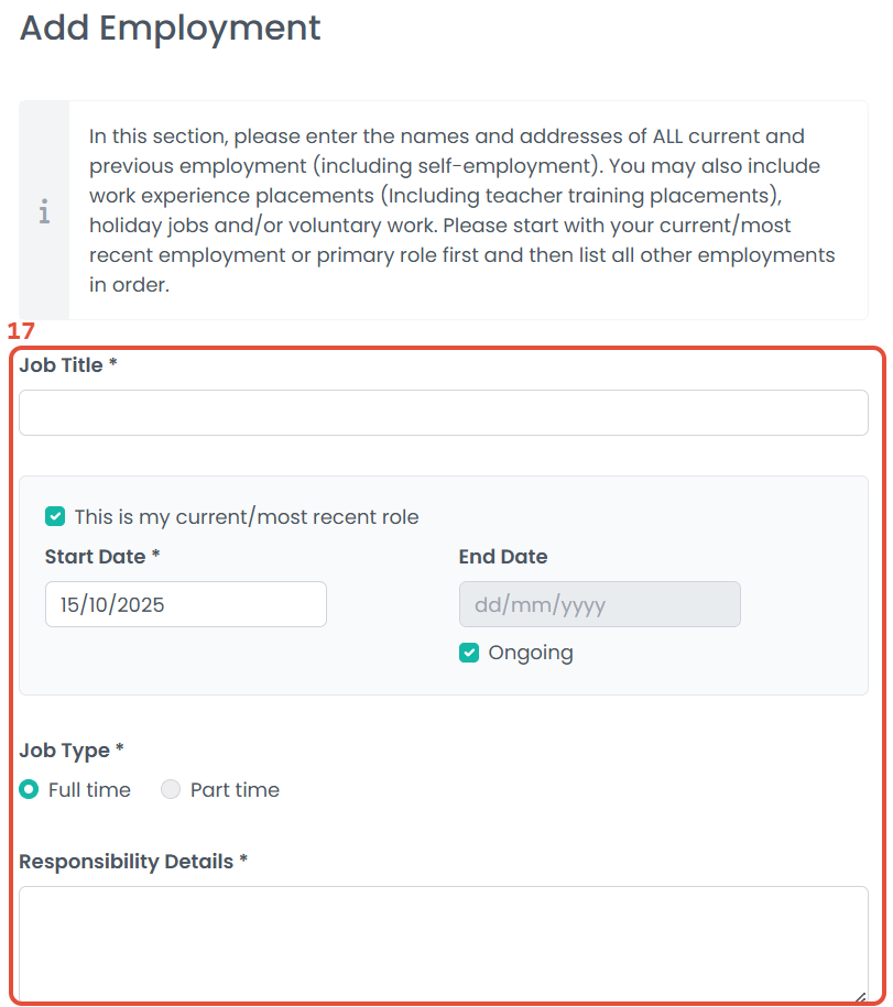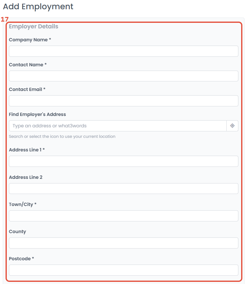 17. Enter the employment title and the dates worked before providing the employer's details.
