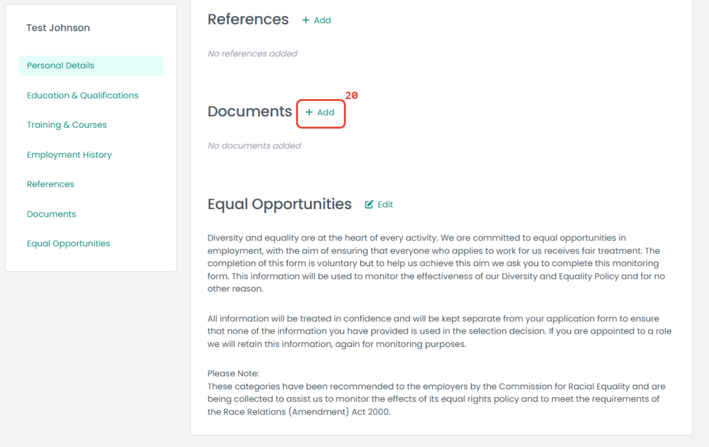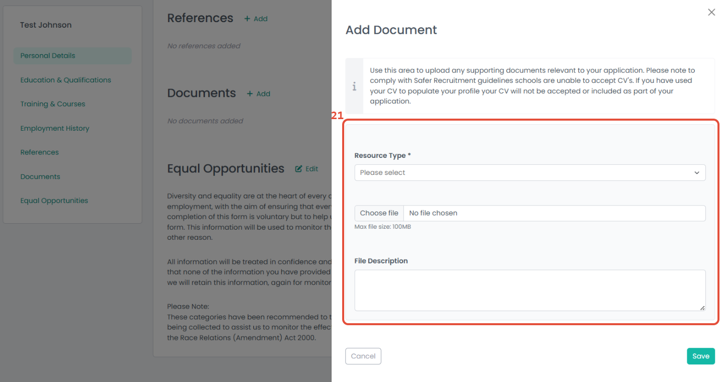 21. Documents can be uploaded to speed up the process when applying for roles or completing checks. Select the Resource Type from the drop-down list of options and upload files from your device, ready to add to applications.